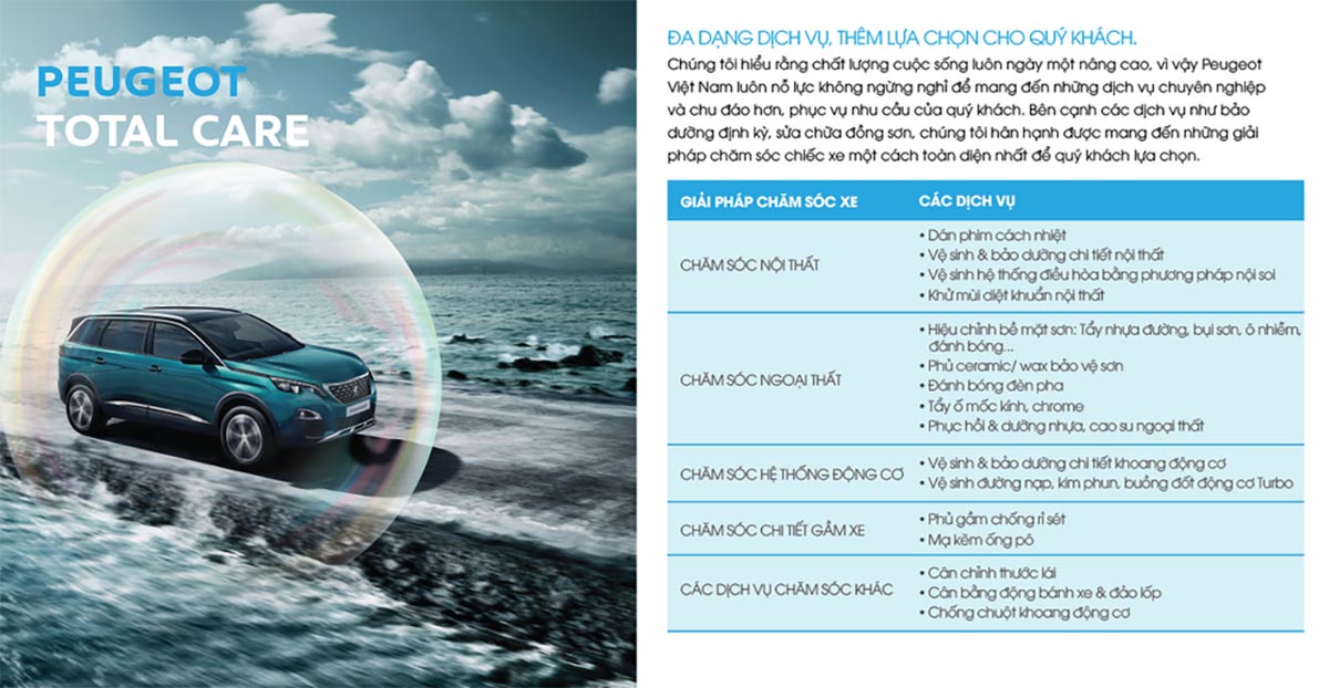 Nhằm giúp khách hàng chăm sóc “xế cưng” của mình một cách toàn diện, hoàn hảo và thuận tiện nhất, Peugeot Việt Nam đã triển khai gói chăm sóc xe toàn diện tại hệ thống xưởng dịch vụ chính hãng trên toàn quốc. Tại đây, khách hàng có thể lựa chọn đa dạng sản phẩm dịch vụ chăm sóc xe với các giải pháp chuyên biệt cho nội – ngoại thất, hệ thống động cơ, khu vực gầm và các dịch vụ chăm sóc làm đẹp xe khác.